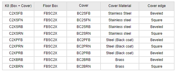 The C2X floor boxes are supplied as a kit which includes the floor box, cover and a temporary construction cover. The Kit number or
